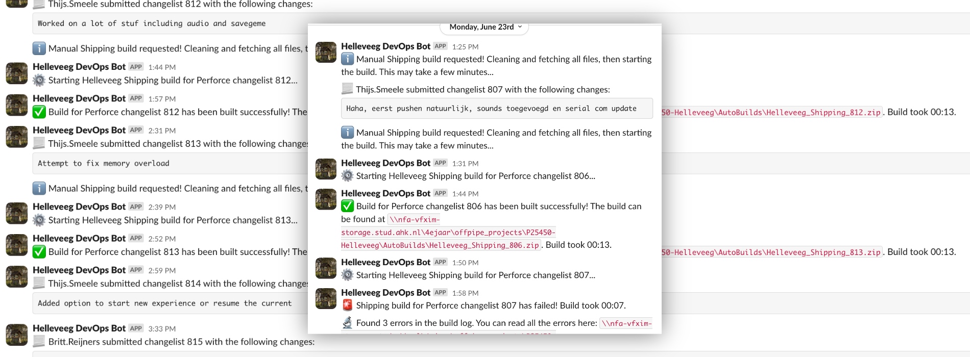 • De Slack bot post een berichtje wanneer iemand een Perforce changelist submit zodat iedereen op de hoogte is van elkaars werk.