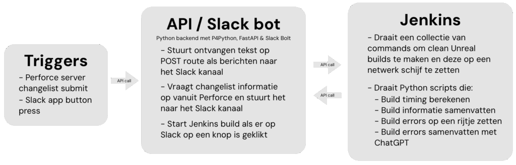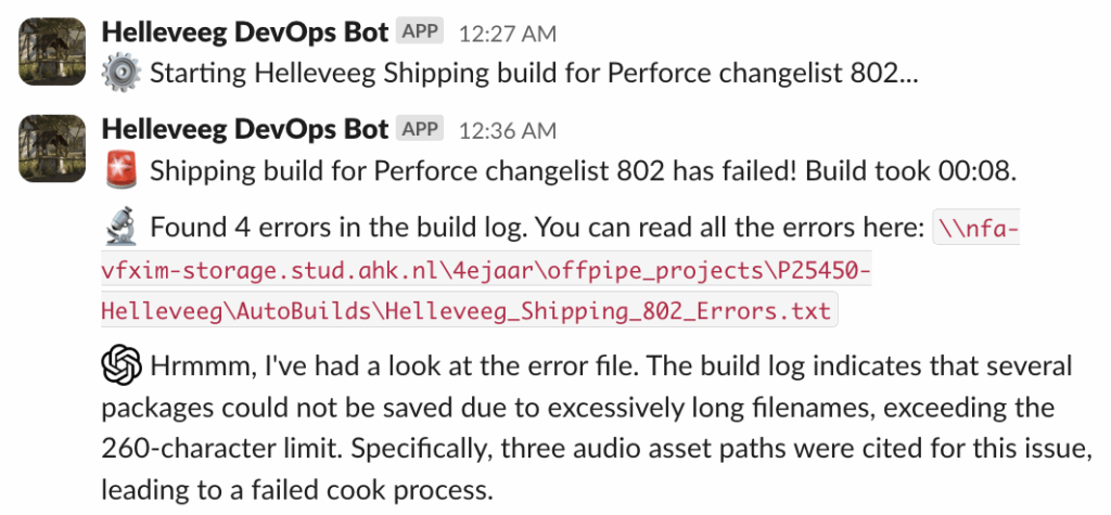 • Wanneer een build faalt worden alle errors uit de Unreal log gehaald en in één net .txt bestandje op de netwerk schijf gezet. Ook worden de errors samengevat door ChatGPT en in het Slack kanaal gepost.