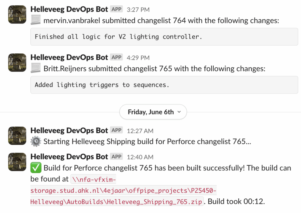 • De Slack bot post een berichtje wanneer iemand een Perforce changelist submit zodat iedereen op de hoogte is van elkaars werk.