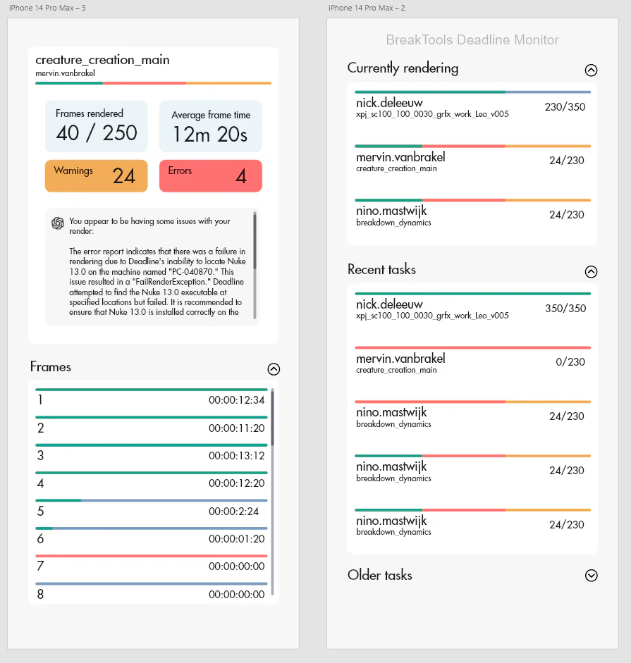 Een groot probleem van renderfarm monitoring software is dat ze vaak extreem complex zijn vormgegeven, wat nuttig is voor echte powerusers maar niet voor alledaagse gebruikers. Mijn doel was dus om alle belangrijke informatie zo overzichtelijk en rustig mogelijk weer te gegeven in een nieuwe user interface die voornamelijk op een telefoon gebruikt kon worden.
