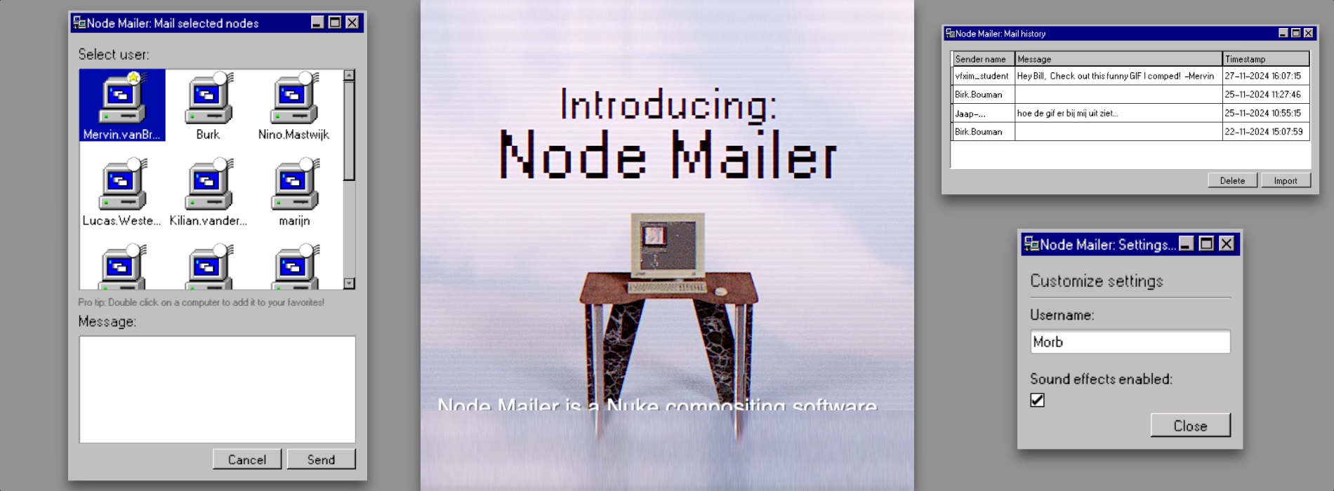 De meeste visual effects-studio’s gebruiken een tool om VFX-setups binnen Nuke met elkaar te delen. Op de Filmacademie hadden we zoiets nog niet, dus kreeg ik de vraag om er een te ontwikkelen. Maar Node Mailer moest niet zomaar een tooltje worden, mijn doel was om het de nieuwe standaard te maken voor Nuke node sharing tools. En als er iets is waar VFX-artist wel van houden is het een geeky grapje, dus het leek mij hilarisch om voor een beetje extra marketing power de hele plugin eruit te laten zien als Windows 95.